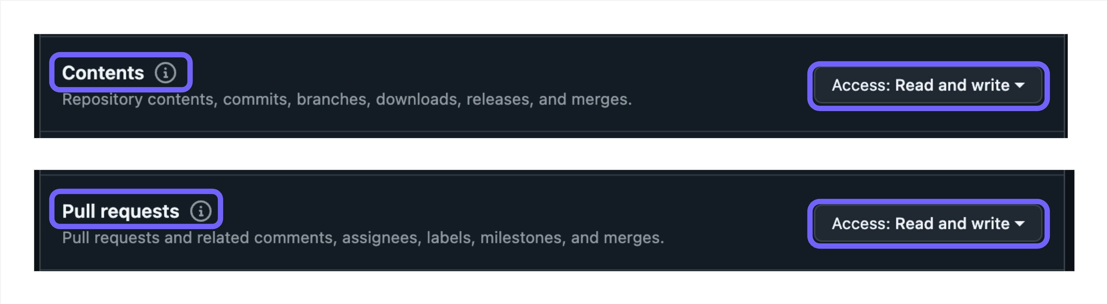 Repositorypermissions, selectContents—>Read and WriteandPull Requests—>Read and Write.