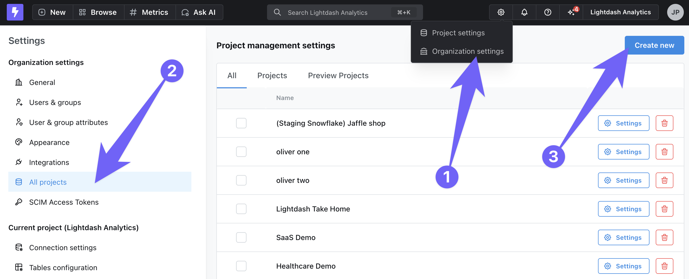 To update an existing connection, go to Project settings by clicking on the gear icon in the top-right navigation.