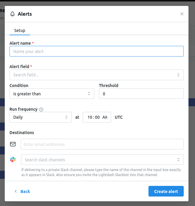 Email alerts are available on all Lightdash Cloud plans. To set up Slack, an organization admin will have to add the Slack integration.Creating an alert