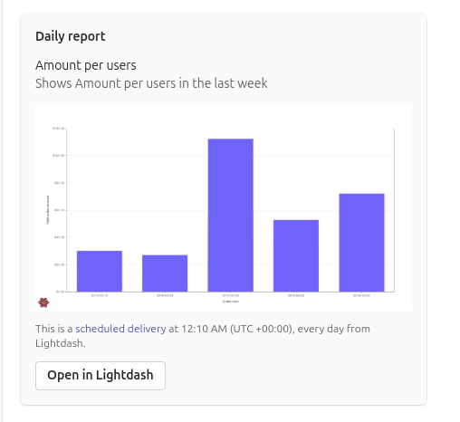 Imagesends an image of the content (chart or dashboard) to your chosen destination. You may also want to send the image as a PDF attachment if you choose to send it over email.CSV: sends a downloadable .csv file of the results table from your chart, or if you’re sending a dashboard, it sends a single message with multiple .csv files for the results tables from each of your charts. You can set thevaluesto either beraw(we remove the formatting applied dates, numbers, or other fields in Lightdash) orformatted(the way the values appear in your table in Lightdash is how they’ll appear in the .csv). You can also adjust thelimitand specify the number of rows that you want to be delivered in your .csv.Results in tablewill deliver the number of results that are currently in the results table for your charts. You can also set a custom number of rows to be delivered usingcustom, or set all results to be delivered so there’s no maximum row limit for each chart usingall results.- Limit on CSV format: We limit CSV downloads to 100,000 cells by default, so if you are trying to download more cells, your file will get truncated.